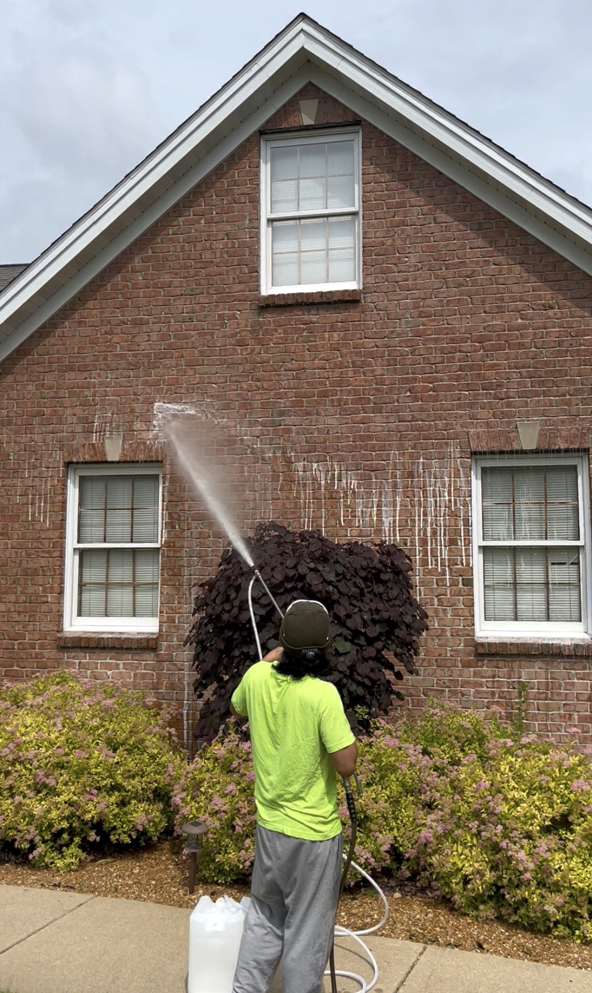 Application of Soft Wash Solution: Our specialized cleaning solution is applied using a low-pressure system to gently clean your home’s surfaces. This solution effectively breaks down and removes stains, algae, mold, mildew, and other organic growths from materials like siding, and brick.